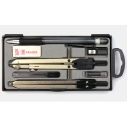 Set contains: Geometry Compass, Divider (Length: 145mm), Pencil (0.5mm), 12 fine line leads for the pencil, Eraser, Lead sharpener, Spare leads
